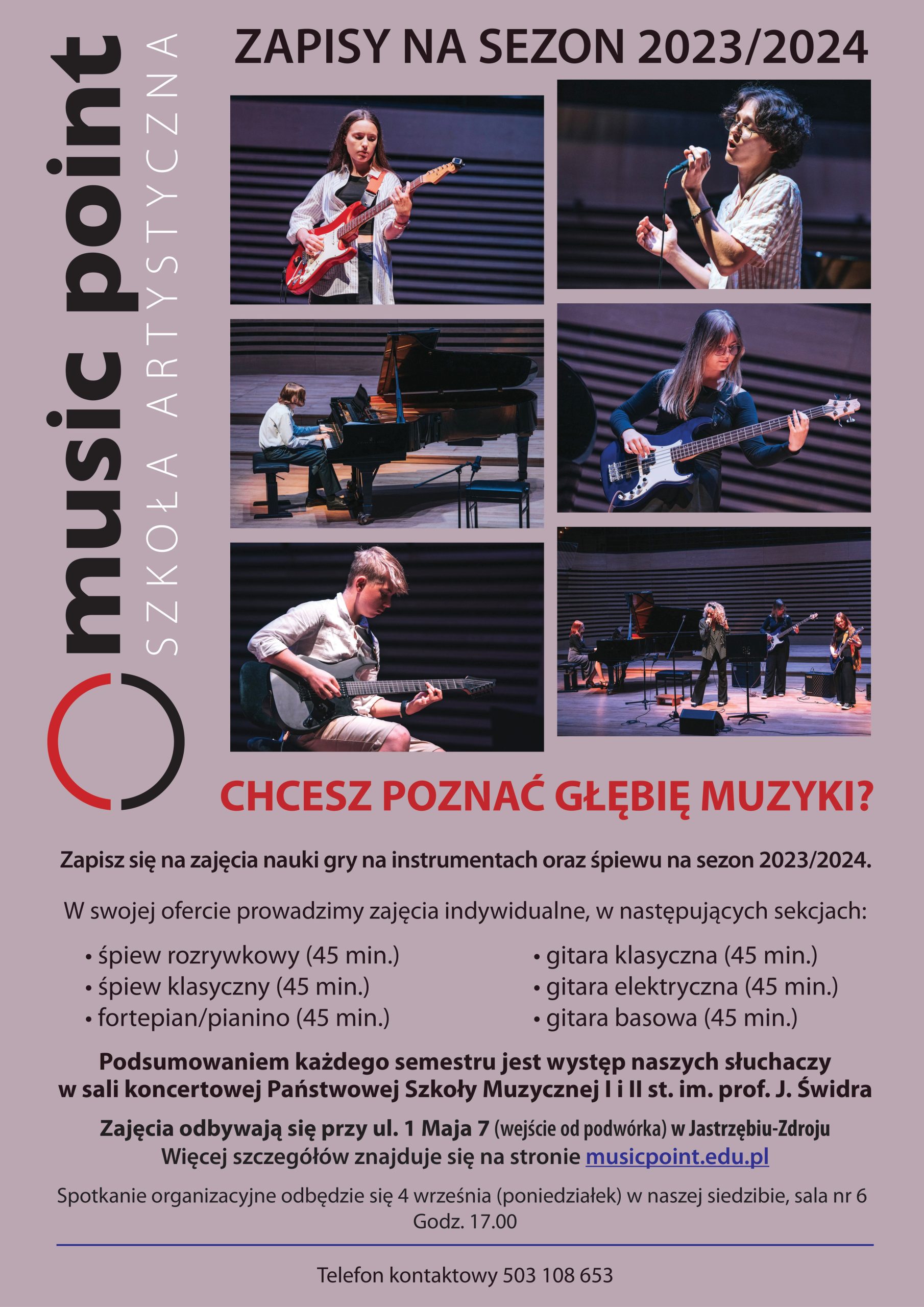 Ogłaszamy zapisy na nowy rok szkolny. Od września będziemy prowadzić zajęcia w klasach: fortepianu, gitary klasycznej, elektrycznej, gitary basowej oraz śpiewu. Dla osób zaawansowanych będą prowadzone także zespoły. Wszystkich zainteresowanych zapraszamy do kontaktu. Informujemy, że 4 września ( w poniedziałek) o godz. 17:00 odbędzie się spotkanie organizacyjne w naszej szkole przy ul. 1 Maja 7 w Jastrzębiu-Zdroju. Na spotkaniu zostanie ustalony harmonogram zajęć.